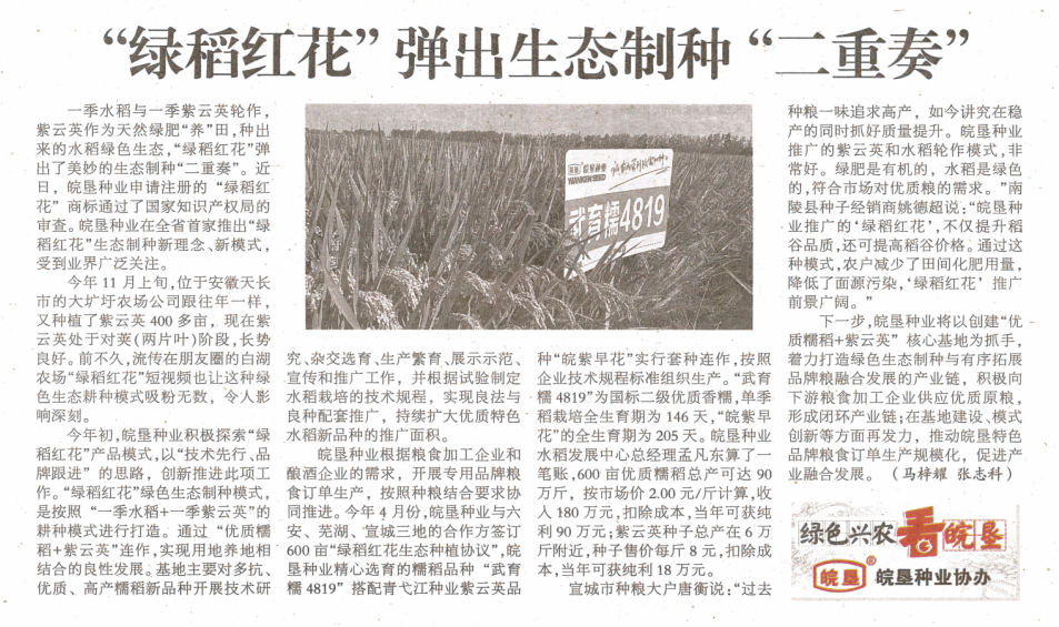 2020年12月18日一季水稻與一季紫云英輪作,紫云英作為天然綠肥“養(yǎng)”田,種出來的水稻綠色生態(tài),“綠稻紅花”彈出了美妙的生態(tài)制種“二重奏”。近日,皖墾種業(yè)申請注冊的“綠稻紅花”商標通過了國家知識產(chǎn)權(quán)局的審查。皖墾種業(yè)在全省首家推出“綠稻紅花”生態(tài)制種新理念、新模式,受到業(yè)界廣泛關注。
