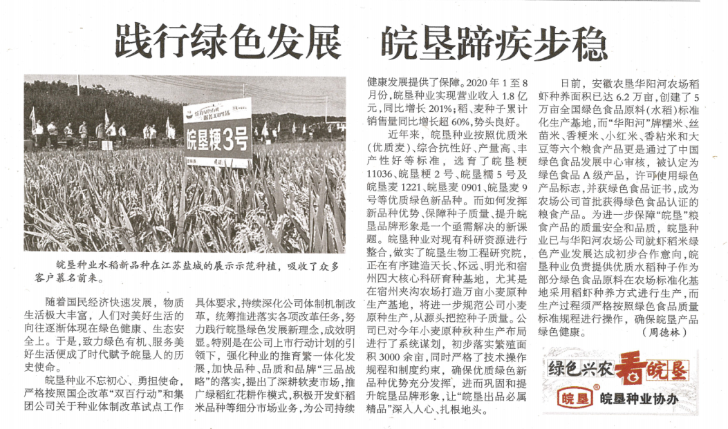 皖墾種業(yè)不忘初心、勇?lián)姑瑖?yán)格按照國(guó)企改革“雙百行動(dòng)”和集團(tuán)公司關(guān)于種業(yè)體制改革試點(diǎn)工作具體要求,持續(xù)深化公司體制機(jī)制改革,統(tǒng)籌推進(jìn)落實(shí)各項(xiàng)改革任務(wù),努力踐行皖墾綠色發(fā)展新理念,成效明顯。特別是在公司上市行動(dòng)計(jì)劃的引領(lǐng)下,強(qiáng)化種業(yè)的推育繁一體化發(fā)展,加快品種、品質(zhì)和品牌“三品戰(zhàn)略”的落實(shí),提出了深耕軟麥?zhǔn)袌?chǎng),推廣綠稻紅花耕作模式,積極開(kāi)發(fā)蝦稻米品種等細(xì)分市場(chǎng)業(yè)務(wù),為公司持續(xù)健康發(fā)展提供了保障。2020年1至8月份,皖墾種業(yè)實(shí)現(xiàn)營(yíng)業(yè)收入1.8億元,同比增長(zhǎng)201%;稻、麥種子累計(jì)銷(xiāo)售量同比增長(zhǎng)超60%,勢(shì)頭良好。