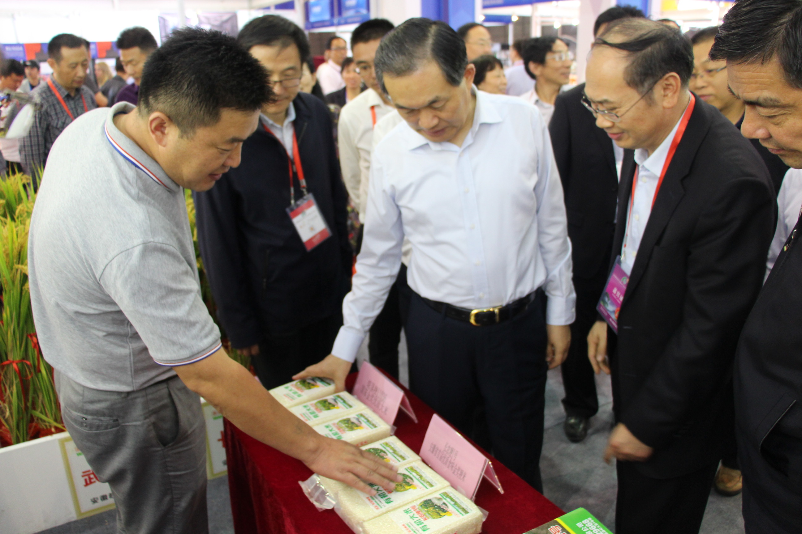 10月10日下午,合肥農(nóng)交會上,張曙光副省長帶隊巡視場館。來到安徽農(nóng)墾展廳后,張曙光認(rèn)真了解皖墾種業(yè)小麥、水稻種子新品種研發(fā)情況,仔細(xì)詢問了剛喜獲金獎的皖墾11036稻米新品種種植推廣情況。在水果展區(qū),張省長拿起一個碭山果園場的翡翠酥梨,掂分量、觀品相、看顏色,夸贊農(nóng)墾水果種植水平高,又了解了水果深加工情況。集團(tuán)公司黨委書記、董事長詹先豪陪同查看農(nóng)墾展廳并匯報了今年的參展情況,集團(tuán)公司工會主席姜三豹陪同.
